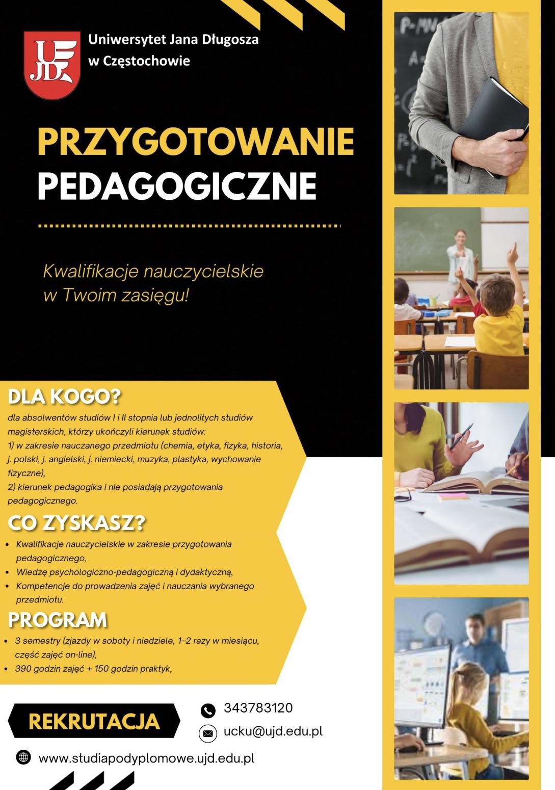 Rozpocznij swoją karierę nauczyciela dzięki studiom podyplomowym na Uniwersytecie Jana Długosza w Częstochowie! Program studiów przeznaczony jest dla absolwentów studiów I i II stopnia oraz jednolitych studiów magisterskich, którzy chcą zdobyć przygotowanie pedagogiczne.